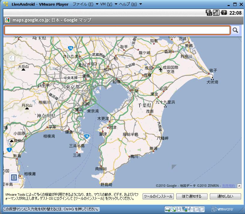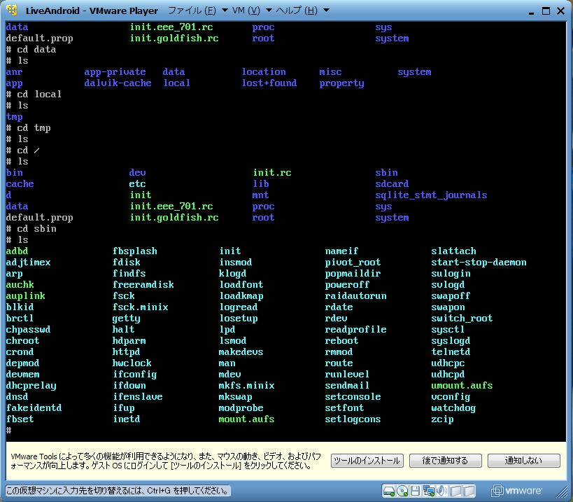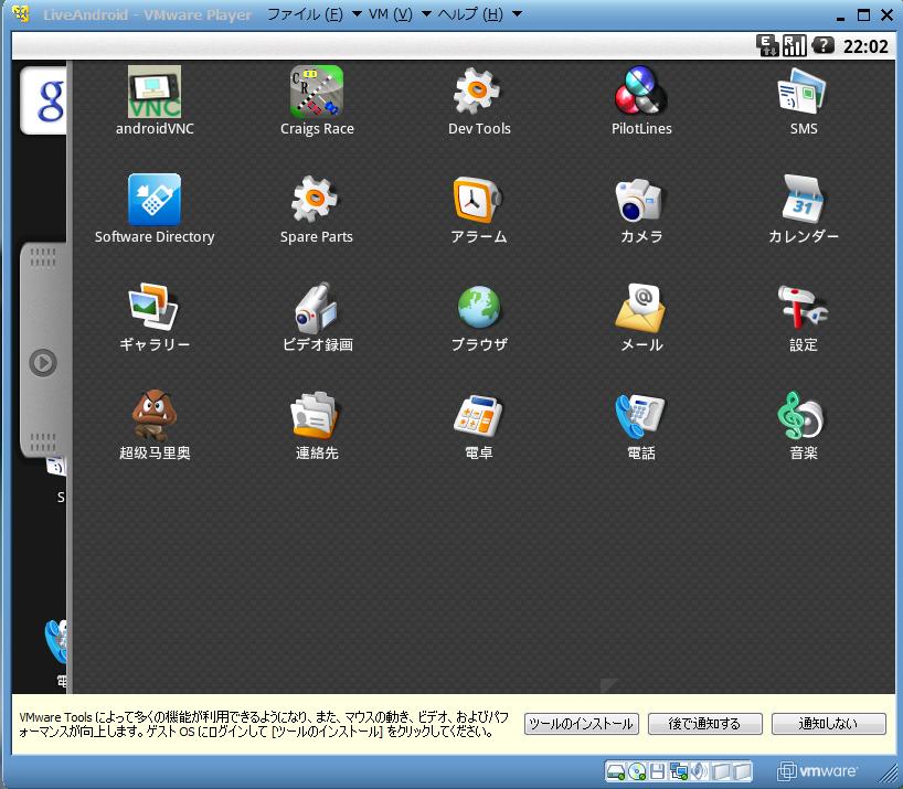 そのメモ. LiveAndroidダウンロード↓ code.google.com/p/live-android/ vmware playerダウンロード↓ www.vmware.com/jp/products/player/ isoイメージが二つあって起動ファイルとして一つに結合したいので, コマンドプロンプト上で, COPY /B [一つ目のisoファイル] + [二つ目のisoファイル] [結合後のファイル名.iso] としてファイルを結合. vmwareの設定で気をつけなければならないのはカーネルの選定. LiveAndroidはlinuxカーネル2.6系らしいのでそちらを選択して設定していったら一発で立ち上がりました. 起動後,バッテリー切れの画面が出ます. OKを押すと,LiveAndroidデブー! メニュー画面↓ ブラウザでgooglemaps開いてみました↓ ちなみにGUIの他CUIでいじることも可能↓ 知識がなくて,まったくいじれませんが... ****操作方法***** Enter:実行 Esc:戻る Alt+[F1]:CUI Alt+[F7]:GUI (L)Windows キー:HOME画面 (R)Windowsキー:メニュー画面 ******************* 試したところ当たり前だけどyoutubeとかプラグインいる系は観れなくて, 日本語入力は出来ませんでした(もしかしてやり方あるのかな??) キーボードも英語キーボードとして設定されているっぽい.